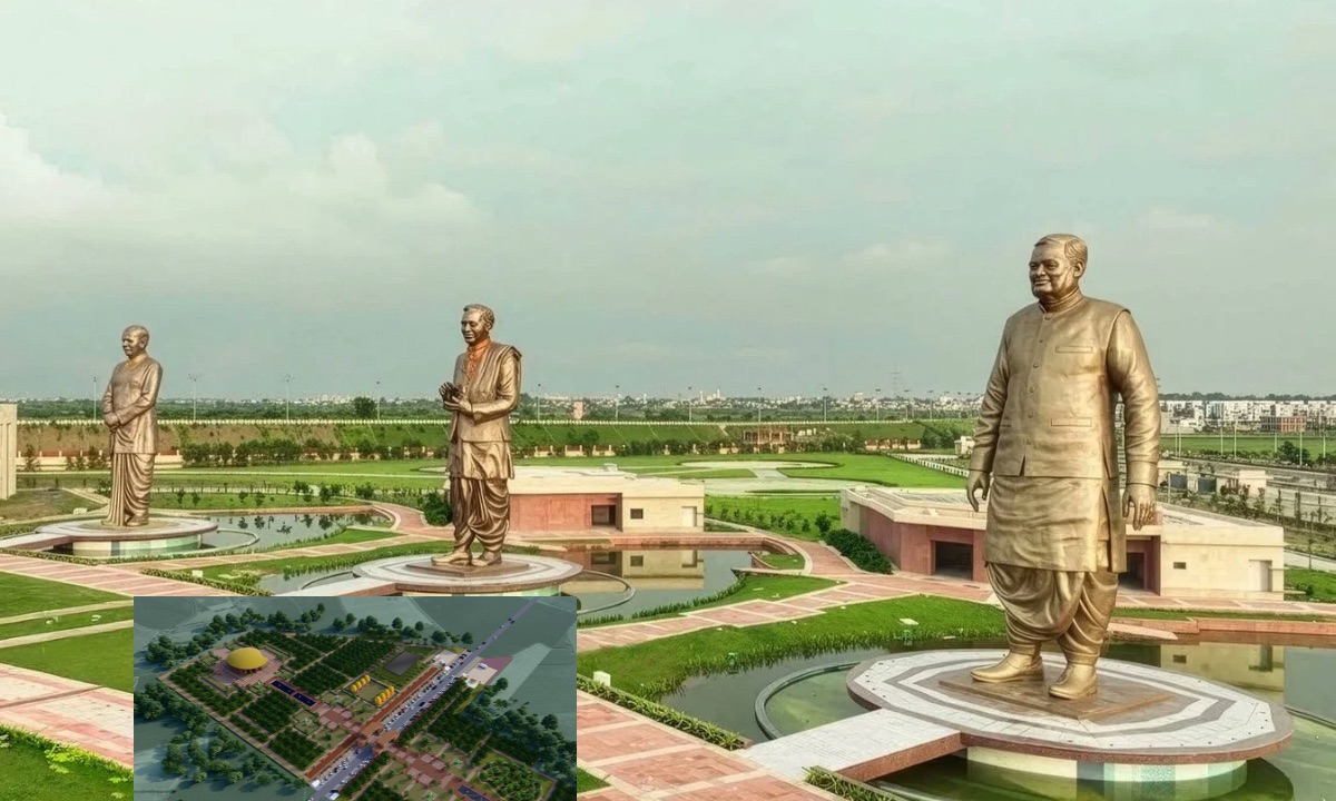 Located on Hardoi Road on the outskirts of the state capital, the Rashtra Prerna Sthal is spread over 65 acres. The complex features three bronze statues, each 65 feet high, of Syama Prasad Mookerjee, Pandit Deendayal Upadhyaya and Atal Bihari Vajpayee. Each statue weighs around 42 tonnes and stands on individual platforms surrounded by water bodies.